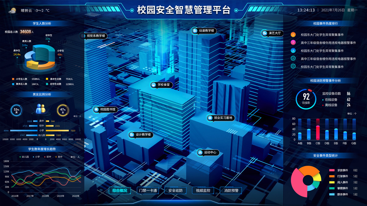 全方位立體式還原院區實貌,分圖層對院區的區域、建筑、單位、安防設備、管理設備、警情等進行查看、監(jiān)控和跟蹤;通過院區各類安防管理設備實時獲取各重點監(jiān)控區域的監(jiān)控數據,對各種突發(fā)事件進行報警。通過人臉識別、車牌識別、行為識別、武器管理、營區設備等各類傳感器,對人、車、物及其行為的全面感知,保障營區安全。 -